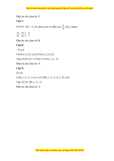 Vậy ƯC(9,15) = Ư(9)∩ Ư(15) = {1, 3} Đáp án cần chọn là: A Câu 9. Ta có: