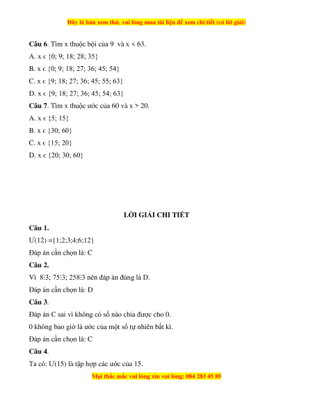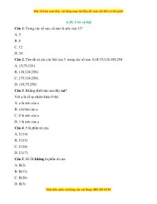 Câu 7. Tìm x thuộc ước của 60 và x > 20. A. x ϵ {5; 15} B. x ϵ {30; 60} C. x ϵ {15; 20} D. x ϵ {20; 30; 60}