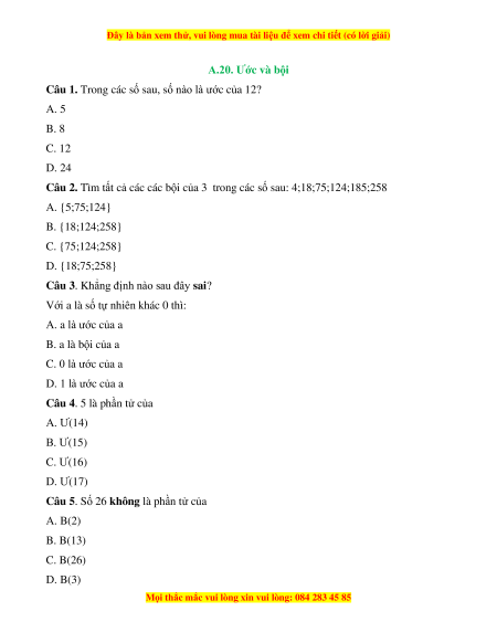 Câu 1. Trong các số sau, số nào là ước của 12? A. 5 B. 8 C. 12 D. 24