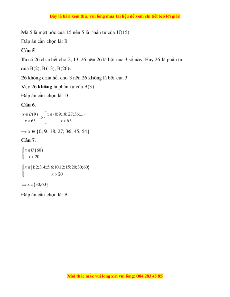 Mà 5 là một ước của 15 nên 5 là phần tử của Ư(15) Đáp án cần chọn là: B Câu 5.