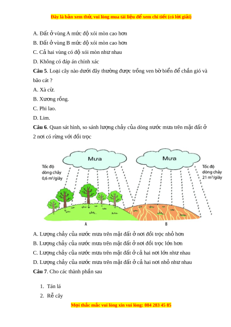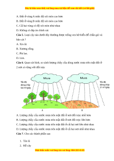 Thành phần nào có kh năng l ả àm c n ả trở dòng ch y c ả a ủ nư c m ớ a ư ? A. 1, 2, 3, 4. B. 1, 2, 3. C. 2, 3, 4. D. 1, 2, 4. Câu 8. Ch n câu ọ sai. Trong cùng m t ộ khu v c, ự so v i ớ r ng t ừ hì n i ơ tr ng t ố r i ả có gì khác biệt v m ề t ặ khí h u ậ ? A. Tốc đ gi ộ ó m nh h ạ n. ơ B. Độ m ẩ thấp h n. ơ C. N ng ắ nhi u và gay g ề t ắ h n, do đó nhi ơ t ệ đ cũng cao h ộ n. ơ D. Lư ng ợ nư c ch ớ y ả ít h n do m ơ a. ư