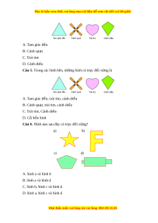 Câu 5. Trong các hình bên, nh ng hì ữ nh có tr c đ ụ ối x ng l ứ à A. Tam giác đ u, ề trái tim, cánh di u ề B. Cánh qu t ạ , trái tim, cánh di u ề C. Trái tim, Cánh di u ề D. Cả bốn hình