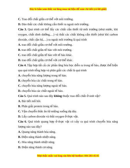 Câu 3. Quá trình cơ thể l y ấ các ch t ấ c n â thi t ế tư môi trư ng ờ (như nư c, ớ khí oxygen, ch t ấ dinh dư ng,…) ỡ và th i ả các ch t ấ không c n â thi t ế (như khí carbon dioxide, chất c n bã,…) ă ra ngoài môi trư ng ờ là quá trình A. trao đổi ch t ấ gi a c ữ ơ thể v i ớ môi trư ng. ờ B. trao đổi ch t ấ gi a ữ t bào v ế i ớ môi trư ng. ờ C. trao đổi ch t ấ gi a t ữ bào v ế i ớ t bào khác. ế D. trao đổi ch t ấ gi a c ữ ơ th v ể i ớ c t ơ h khác. ể Câu 4. T p ậ h p ợ t t ấ c ả các ph n ả ng ứ hóa h c ọ di n ê ra trong t ế bào, đư c ợ th ể hi n ệ qua quá trình tổng h p và ợ phân gi i ả các ch t ấ là quá trình A. chuy n hóa năng l ể ư ng ợ trong t bào. ế B. chuy n