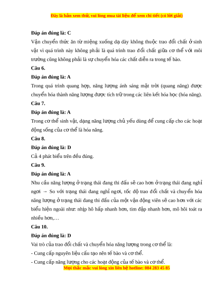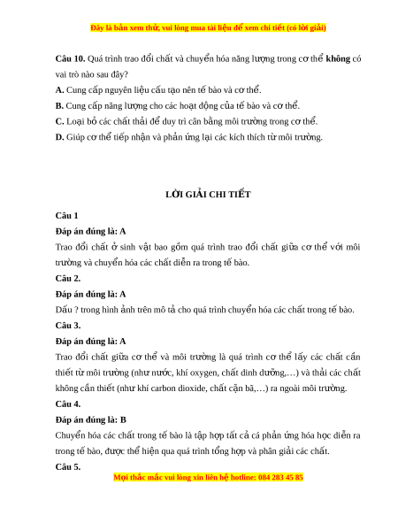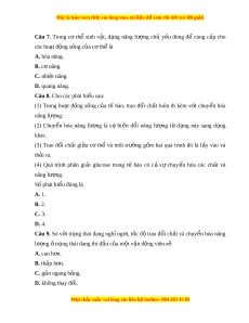 A. Cung cấp nguyên li u c ệ u t ấ o nên t a bào và c ế t ơ h . ể B. Cung c p năng l ấ ư ng cho các ợ ho t a đ ng c ô a ủ t bào và c ế ơ th . ể C. Lo i a b các ch o ất th i ả đ duy t ể rì cân b ng m ă ôi trư ng ờ trong c t ơ h . ể D. Giup c t ơ h t ể i p nh ế n ậ và ph n ả ng ứ l i a các kích thích t m ư ôi trư ng. ờ LỜI GIẢI CHI TI T Ế Câu 1