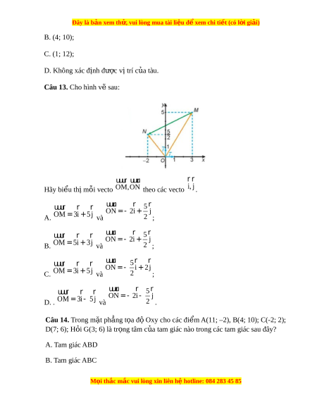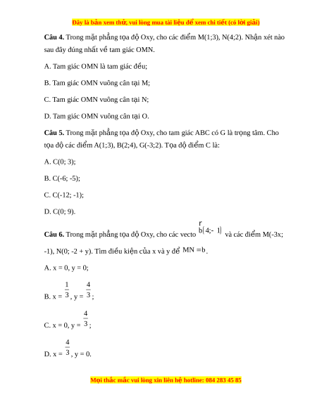 Đây là bản xem th , vu ử i lòng mua tài li u ệ đ xe ể m chi ti t (c ế ó l i ờ gi i ả ) Câu 4. Trong m t ặ ph ng t ẳ a ọ đ O ộ xy, cho các đi m ể M(1;3), N(4;2). Nh n ậ xét nào sau đây đúng nhất v t ề am giác OMN.