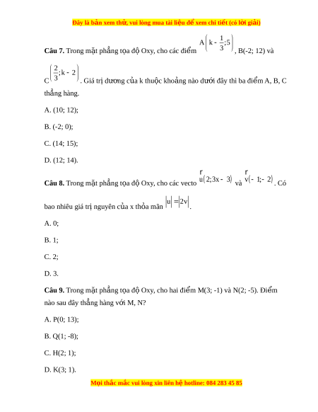 Đây là bản xem th , vu ử i lòng mua tài li u ệ đ xe ể m chi ti t (c ế ó l i ờ gi i ả ) 1 A k ;5 Câu 7. Trong m t ặ ph ng t ẳ a ọ đ O ộ xy, cho các đi m ể 3 , B(-2; 12) và 2 ;k 2 C 3 . Giá tr d ị ư ng ơ c a k t ủ hu c kho ộ ng ả nào dư i ớ đây thì ba đi m ể A, B, C th ng hàng. ẳ A. (10; 12); B. (-2; 0); C. (14; 15); D. (12; 14). r r u( 2;3x - ) v(- 1;- 2) Câu 8. Trong m t ặ ph ng t ẳ a ọ đ O ộ xy, cho các vecto 3 và . Có u 2v