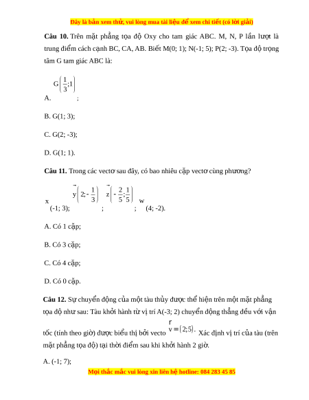 x 3 5 5 w (-1; 3); ; ; (4; -2). A. Có 1 c p; ặ B. Có 3 c p; ặ C. Có 4 c p; ặ D. Có 0 c p. ặ Câu 12. S chuy ự n đ ể ng c ộ a ủ m t ộ tàu th y đ ủ ư c ợ th hi ể n t ệ rên m t ộ m t ặ ph ng ẳ t a đ ọ nh ộ ư sau: Tàu kh i ở hành t v ừ t ị rí A(-3; 2) chuy n đ ể ng t ộ h ng ẳ đ u v ề i ớ v n ậ rv=(2; ) tốc (tính theo gi ) ờ đư c bi ợ u t ể h b ị i ở vecto 5 . Xác đ nh v ị t ị rí c a t ủ àu (trên m t ặ ph ng ẳ t a đ ọ ) ộ t i ạ th i ờ đi m ể sau khi kh i ở hành 2 gi . ờ A. (-1; 7); M i