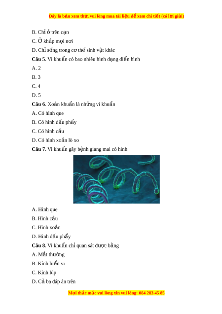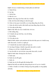 Câu 5. Vi khuẩn có bao nhiêu hình d ng đi ạ n ể hình A. 2 B. 3 C. 4 D. 5 Câu 6. Xo n khu ắ ẩn là nh ng vi ữ khu n ẩ A. Có hình que B. Có hình d u ph ấ y ẩ C. Có hình c u ầ D. Có hình xo n ắ lò xo