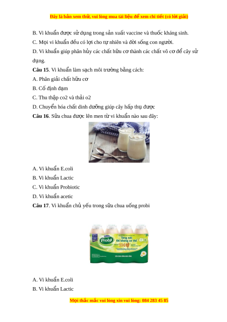 Câu 15. Vi khuẩn làm s ch ạ môi trư ng ờ b ng cách: ằ A. Phân gi i ả ch t ấ h u c ữ ơ B. Cố định đ m ạ C. Thu th p ậ co2 và th i ả o2 D. Chuy n hóa ể ch t ấ dinh dư ng ỡ giúp cây h p t ấ h đ ụ ư c ợ Câu 16. S a chua đ ữ ư c ợ lên men t vi ừ khu n nào s ẩ au đây: A. Vi khuẩn E.coli B. Vi khuẩn Lactic C. Vi khuẩn Probiotic D. Vi khuẩn acetic