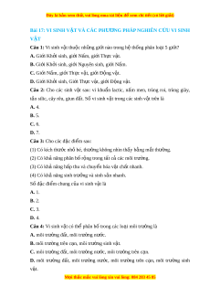 Đây là bản xem th , vu ử i lòng mua tài li u ệ đ xe ể m chi ti t ế (có l i ờ gi i ả ) Bài 17: VI SINH V T Ậ VÀ CÁC PHƯ N Ơ G PHÁP NGHIÊN C U Ứ VI SINH VẬT Câu 1: Vi sinh v t ậ thu c ộ nh ng gi ữ i ớ nào trong h t ệ h ng phân l ố o i ạ 5 gi i ớ ? A. Gi i ớ Kh i ở sinh, gi i ớ N m ấ , gi i ớ Th c v ự t ậ . B. Gi i ớ Kh i ở sinh, gi i ớ Nguyên sinh, gi i ớ N m ấ . C. Gi i ớ Nấm, gi i ớ Th c v ự t ậ , gi i ớ Đ ng v ộ t ậ . D. Gi i ớ Kh i ở sinh, Gi i ớ Th c v ự t ậ , gi i ớ Đ ng v ộ t ậ .
