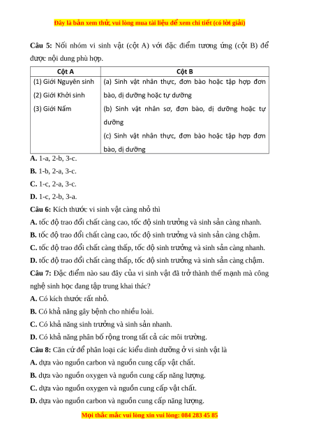 (c) Sinh vật nhân thực, đơn bào hoặc tập hợp đơn bào, dị dưỡng A. 1-a, 2-b, 3-c. B. 1-b, 2-a, 3-c. C. 1-c, 2-a, 3-c. D. 1-c, 2-b, 3-a. Câu 6: Kích thư c vi ớ sinh v t ậ càng nh t ỏ hì A. tốc đ t ộ rao đổi ch t ấ càng cao, t c đ ố s ộ inh trư ng và ở sinh s n ả càng nhanh. B. tốc đ t ộ rao đổi ch t ấ càng cao, t c đ ố ộ sinh trư ng ở và sinh s n càng ả ch m ậ . C. tốc đ t ộ rao đổi ch t ấ càng th p, t ấ c đ ố s ộ inh trư ng ở và sinh s n càng ả nhanh. D. tốc đ t ộ rao đổi ch t ấ càng th p, t ấ c đ ố s ộ inh trư ng ở và sinh s n càng ả ch m ậ . Câu 7: Đ c ặ đi m ể nào sau đây c a ủ vi sinh v t ậ đã tr ở thành th ế m nh ạ mà công nghệ sinh h c đang t ọ p ậ trung khai thác? A. Có kích thư c r ớ t ấ nh . ỏ
