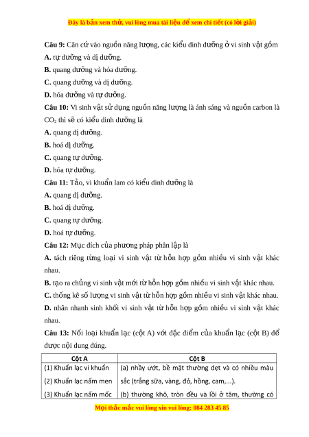 Đây là bản xem th , vu ử i lòng mua tài li u ệ đ xe ể m chi ti t ế (có l i ờ gi i ả ) Câu 9: Căn c vào ngu ứ ồn năng lư ng, ợ các ki u di ể nh dư ng ỡ vi ở sinh v t ậ g m ồ A. t d ự ư ng và d ỡ i dư ng. ỡ B. quang dư ng ỡ và hóa dư ng. ỡ C. quang dư ng và d ỡ i dư ng. ỡ D. hóa dư ng và t ỡ d ự ư ng. ỡ Câu 10: Vi sinh v t ậ s ư d ng u ngu n ồ năng lư ng