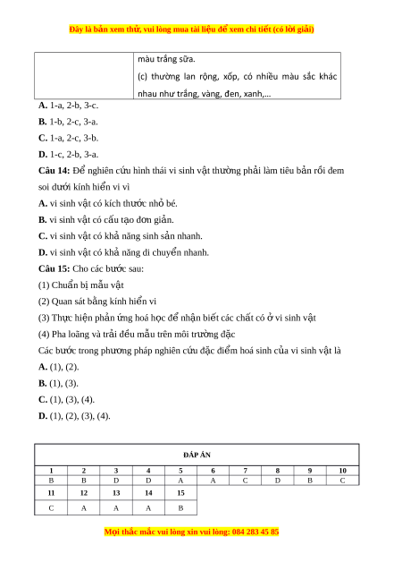 Câu 15: Cho các bư c s ớ au: (1) Chu n ẩ b m i u v ẫ t ậ (2) Quan sát b ng ằ kính hi n vi ể (3) Th c ự hi n ph ệ n ả ng hoá h ứ c ọ đ nh ể n bi ậ t ế các ch t ấ có vi ở sinh v t ậ (4) Pha loãng và tr i ả đ u m ề u t ẫ rên môi trư ng ờ đ c ặ Các bư c ớ trong phư ng ơ pháp nghiên c u đ ứ c ặ đi m ể hoá sinh c a ủ vi sinh v t ậ là A. (1), (2). B. (1), (3). C. (1), (3), (4). D. (1), (2), (3), (4). ĐÁP ÁN 1 2 3 4 5 6 7 8 9 10 B B D D A A C D B C 11 12 13 14 15 C A A A B M i ọ thắc m c