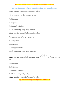 ắ nhau nh ng không vuông góc nhau. ư x y d : 1 1 Câu 3. Xét v ị trí tư n ơ g đ i ố c a ủ hai đư n ờ g th n ẳ g 3 4 và d2 : 3x + 4y - 10 = 0. A. Trùng nhau. B. Song song. C. Vuông góc v i ớ nhau. D. C t