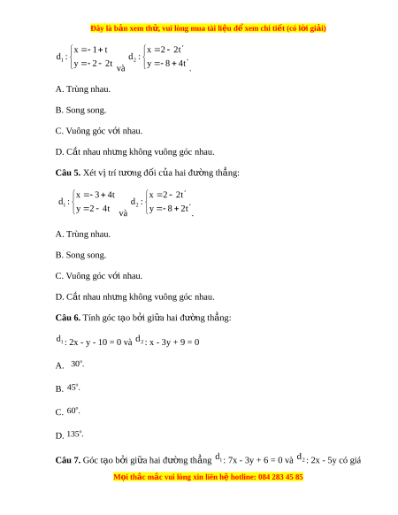 Đây là bản xem th , vu ử i lòng mua tài li u ệ đ xe ể m chi ti t (c ế ó l i ờ gi i ả ) x 1 t x 2 2t d : d : 1 y 2 2 2t và y 8 4t . A. Trùng nhau. B. Song song. C. Vuông góc v i ớ nhau. D. C t