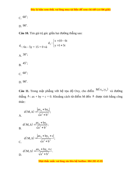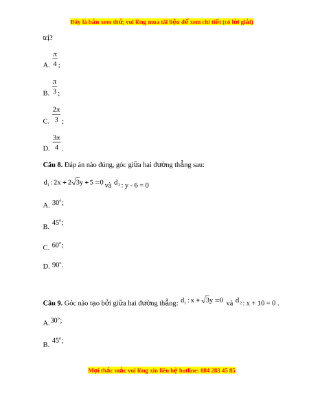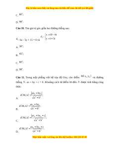 Câu 8. Đáp án nào đúng, góc gi a ữ hai đư ng t ờ h ng ẳ sau: d : 2x 2 3y 5 0 d 1 và 2 : y - 6 = 0 o A. 30 ; o 45 ; B. o C. 60 ; D. o 90 . Câu 9. Góc nào t o ạ b i ở gi a hai ữ đư ng ờ th ng: ẳ d : x 3y 0 d 1 và 2 : x + 10 = 0 . o A.30 ; o 45 ; B. M i