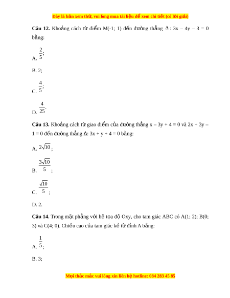 Câu 12. Kho ng cách t đi m M(-1; 1) đ n đ ng th ng ả ừ ể ế ườ ẳ : 3x – 4y – 3 = 0