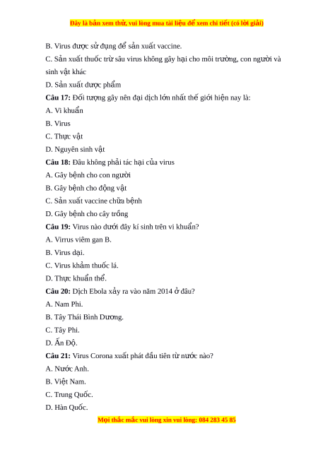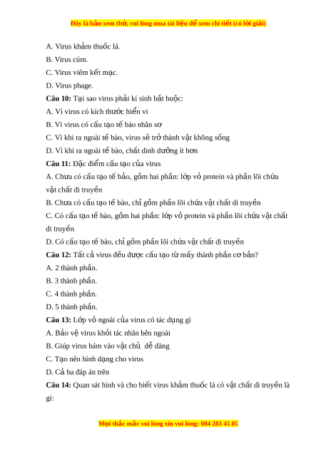 Đây là bản xem th , vu ử i lòng mua tài li u ệ đ xe ể m chi ti t ế (có l i ờ gi i ả ) A. Virus kh m ả thu c ố lá. B. Virus cúm. C. Virus viêm k t ế m c. ạ D. Virus phage. Câu 10: T i ạ sao virus ph i ả kí sinh b t ắ bu c: ộ A. Vì virus có kích thư c ớ hi n ể vi B. Vì virus có c u t ấ o ạ t bào nhân s ế ơ