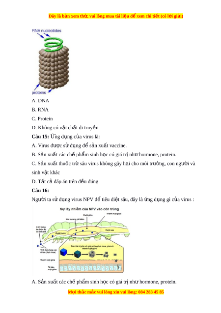 Đây là bản xem th , vu ử i lòng mua tài li u ệ đ xe ể m chi ti t ế (có l i ờ gi i ả ) A. DNA B. RNA C. Protein D. Không có v t ậ chất di truy n ề Câu 15: Ứng d ng c ụ a ủ virus là: