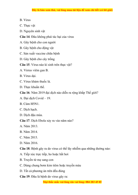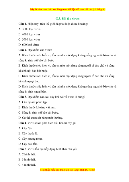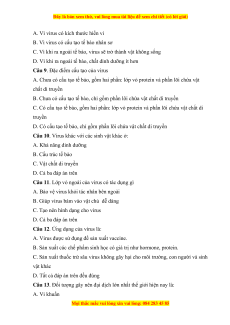 Câu 1. Hiện nay, trên thế giới đã phát hiện được khoảng: A. 3000 loại virus B. 4000 loại virus C. 5000 loại virus D. 600 loại virus