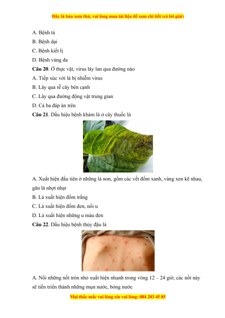 Câu 15. Virus nào kí sinh trên thực vật? A. Virrus viêm gan B. B. Virus dại. C. Virus khảm thuốc lá. D. Thực khuẩn thể.