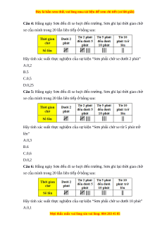 Đây là bản xem th , vu ử i lòng mua tài li u ệ đ xe ể m chi ti t ế (có l i ờ gi i ả ) Câu 4: H ng ằ ngày S n đ ơ u đi ề xe buýt đ n t ế rư ng. S ờ n ghi ơ l i ạ th i ờ gian ch ờ xe c a m ủ ình trong 20 l n l ầ iên ti p ế ở b ng s ả au: Hãy tính xác suất th c ự nghi m ệ c a ủ s ki ự n “ ệ S n ph ơ i ả ch xe d ờ ư i ớ 2 phút” A.0,2 B.5 C.0,5 D.0,25 Câu 5: H ng ằ ngày S n đ ơ u đi ề xe buýt đ n t ế rư ng. S ờ n ghi ơ l i ạ th i ờ gian ch ờ xe c a m ủ ình trong 20 l n l ầ iên ti p ế ở b ng s ả au: Hãy tính xác suất th c ự nghi m ệ c a ủ s ki ự n “ ệ S n ph ơ i ả ch xe t ờ 5 phút ừ tr ở lên” A.0,3 B.6 C.0,6 D.0,2 Câu 6: H ng ằ ngày S n đ ơ u đi ề xe buýt đ n t ế rư ng. S ờ n ghi ơ l i ạ th i ờ gian ch ờ xe c a m ủ ình trong 20 l n l ầ iên ti p ế ở b ng s ả au: Hãy tính xác suất th c ự nghi m ệ c a ủ s ki ự n “ ệ S n ph ơ i ả ch xe d ờ ư i ớ 10 phút” A.0,1 M i