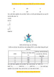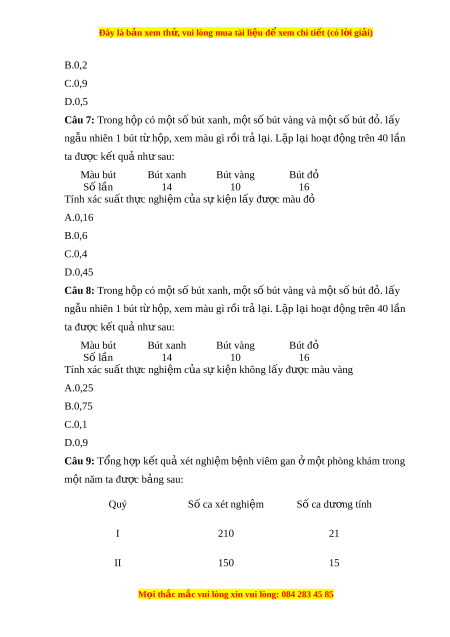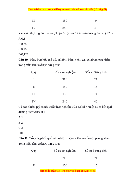 Đây là bản xem th , vu ử i lòng mua tài li u ệ đ xe ể m chi ti t ế (có l i ờ gi i ả ) III 180 9 IV 240 48 Xác suất th c ự nghi m ệ c a ủ s ki ự n “m ệ t ộ ca có k t ế qu d ả ư ng t ơ ính quý I” là A.0,1 B.0,25 C.0,15 D.0,125 Câu 10: T ng h ổ p ợ k t ế qu xét ả nghi m ệ b nh vi ệ êm gan m ở t ộ phòng khám trong m t ộ năm ta đư c b ợ ng ả sau: Quý Số ca xét nghi m ệ Số ca dư ng t ơ ính I 210 21 II 150 15 III 180 9 IV 240 48