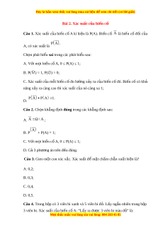 ể sai trong các phát bi u s ể au: A. V i ớ m i ọ bi n c ế ố A, 0 ≤ P(A) ≤ 1; B. P( ) = 1, P(∅) = 0; C. Xác su t ấ c a ủ m i ỗ bi n ế c ố đo lư ng ờ x y ả ra c a ủ bi n ế c ố đó. Bi n ế c có ố khả năng x y r ả a càng cao thì xác su t ấ c a ủ nó càng xa 1; P A P A 1 . D. Câu 2. Ch n kh ọ ng ẳ đ nh ị đúng trong các kh ng ẳ đ nh s ị au: A. A \ A ; A B. P + P(A) = 1; C. V i ớ m i ọ bi n c ế ố A, 0 ≤ P(A) ≤ 1; D. Cả 3 phư ng án t ơ rên đ u đúng. ề Câu 3. Gieo m t