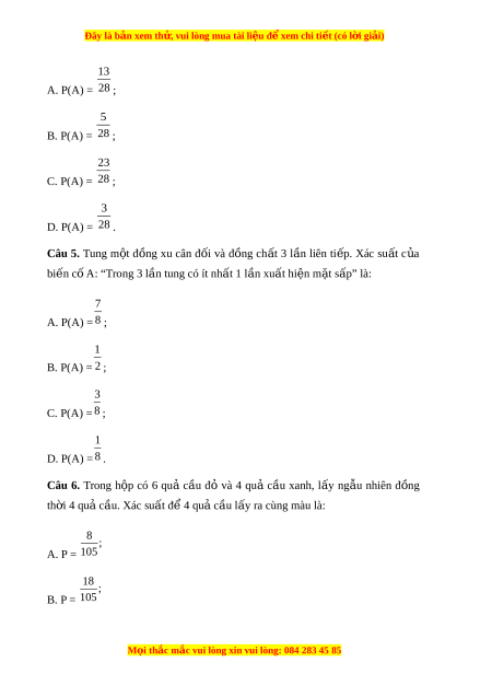 Đây là bản xem th , vu ử i lòng mua tài li u ệ đ xe ể m chi ti t (c ế ó l i ờ gi i ả ) 13 A. P(A) = 28 ; 5 B. P(A) = 28 ; 23 C. P(A) = 28 ; 3 D. P(A) = 28 . Câu 5. Tung m t ộ đ ng ồ xu cân đ i ố và đ ng ồ ch t ấ 3 l n ầ liên ti p. ế Xác su t ấ c a ủ bi n c ế