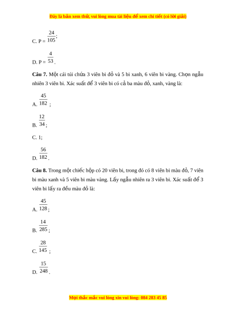 Đây là bản xem th , vu ử i lòng mua tài li u ệ đ xe ể m chi ti t ế (có l i ờ gi i ả ) 24 ; C. P = 105 4 D. P = 53 . Câu 7. M t ộ cái túi ch a