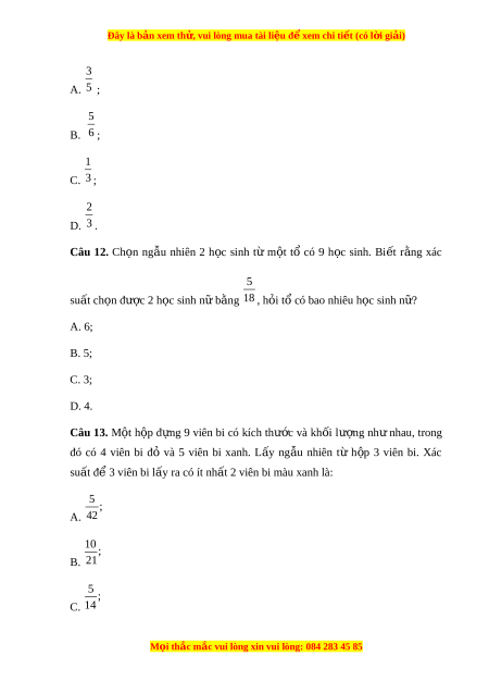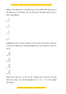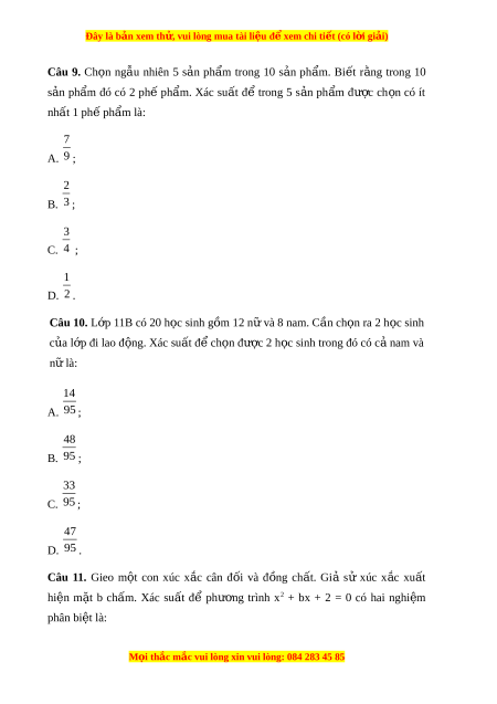 Đây là bản xem th , vu ử i lòng mua tài li u ệ đ xe ể m chi ti t (c ế ó l i ờ gi i ả ) Câu 9. Ch n ọ ng u ẫ nhiên 5 s n ả ph m ẩ trong 10 s n ả ph m ẩ . Bi t ế r ng ằ trong 10 s n ả ph m ẩ đó có 2 phế ph m ẩ . Xác su t ấ đ ể trong 5 s n ả ph m ẩ đư c ợ ch n ọ có ít nhất 1 ph ph ế m ẩ là: 7 A. 9 ; 2 B. 3 ; 3 C. 4 ; 1 D. 2 . Câu 10. L p 1 ớ 1B có 20 h c ọ sinh gồm 12 n và 8 nam ữ . C n ch ầ n ọ ra 2 h c s ọ inh c a ủ l p ớ đi lao đ ng. ộ Xác su t ấ đ ể ch n ọ đư c ợ 2 h c ọ sinh trong đó có c ả nam và n l ữ à: 14 A. 95 ; 48 B. 95 ; 33 C. 95 ; 47 D. 95 . Câu 11. Gieo m t ộ con xúc x c ắ cân đ i ố và đ ng ồ ch t ấ . Giả sử xúc x c ắ xu t ấ hiện m t ặ b ch m ấ . Xác su t ấ để phư ng