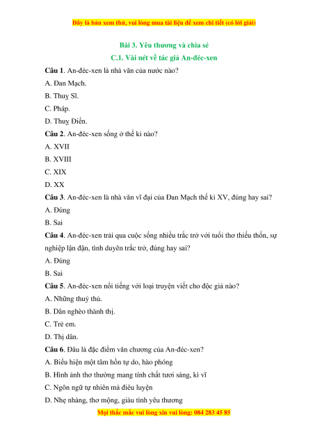 Câu 2. An-đéc-xen sống ở thế kỉ nào? A. XVII B. XVIII C. XIX D. XX