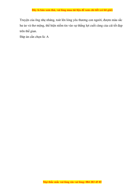 hư ảo và thơ mộng, thể hiện niềm tin vào sự thắng lợi cuối cùng của cái tốt đẹp trên thế gian. Đáp án cần chọn là: D Câu 7.