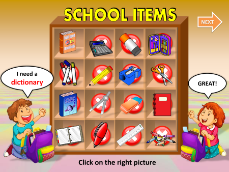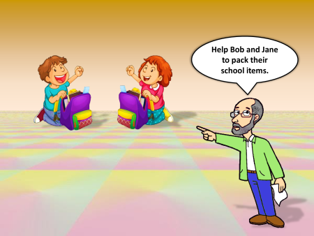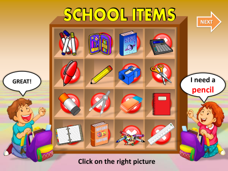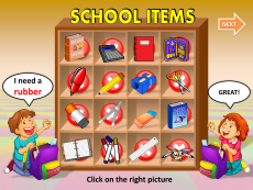 QUIZ Help Bob and Jane to pack their school items. NEXT I need a rubber GREAT!