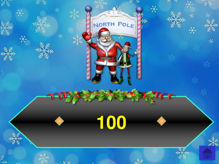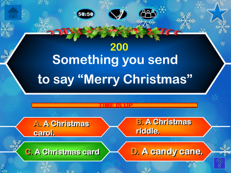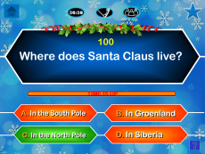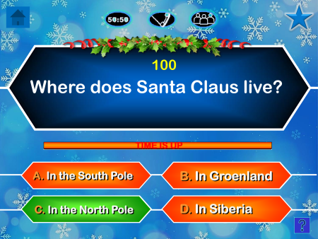 Where does Santa Claus live? TIME IS UP A. In the South Pole B. In Groenland C. In the North Pole D. In Siberia 100