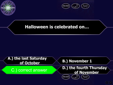 Halloween is celebrated on… A.) the last Saturday of October B.) November 1 C.) 31 Oct C.) cor ob re er