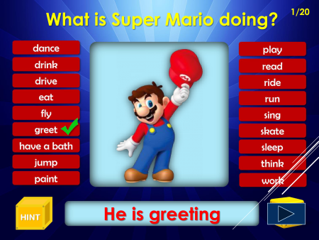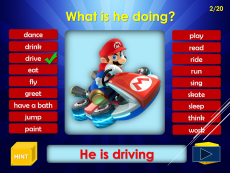 What is Super Mario doing? 1/20 HINT He is greeting What is he doing? 2/20 HINT He is driving