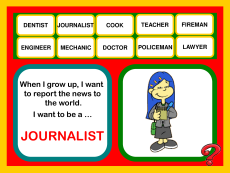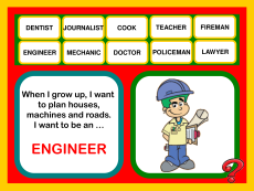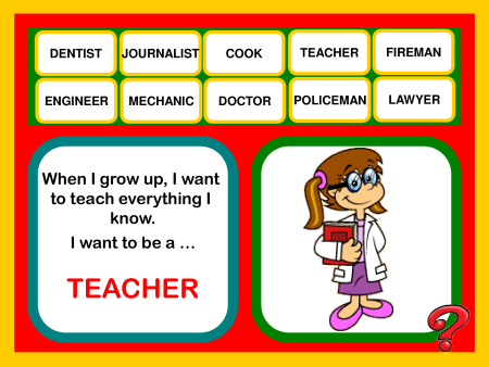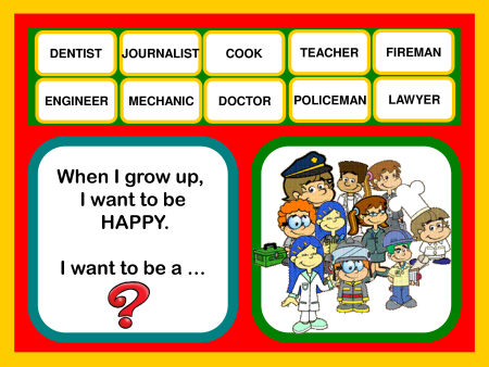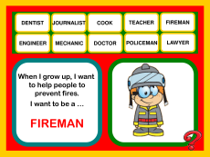 DENTIST JOURNALIST COOK TEACHER FIREMAN ENGINEER MECHANIC DOCTOR POLICEMAN LAWYER When I grow up, I want to be HAPPY. I want to be a … DENTIST JOURNALIST COOK TEACHER FIREMAN ENGINEER MECHANIC DOCTOR POLICEMAN LAWYER When I grow up, I want to teach everything I know. I want to be a … TEACHER DENTIST JOURNALIST COOK TEACHER FIREMAN ENGINEER MECHANIC DOCTOR POLICEMAN LAWYER When I grow up, I want to help people to prevent fires. I want to be a … FIREMAN DENTIST JOURNALIST COOK TEACHER FIREMAN ENGINEER MECHANIC DOCTOR POLICEMAN LAWYER When I grow up, I want to plan houses, machines and roads. I want to be an … ENGINEER