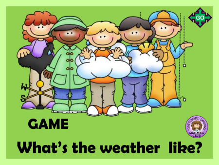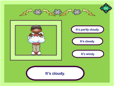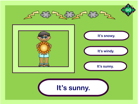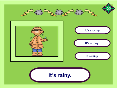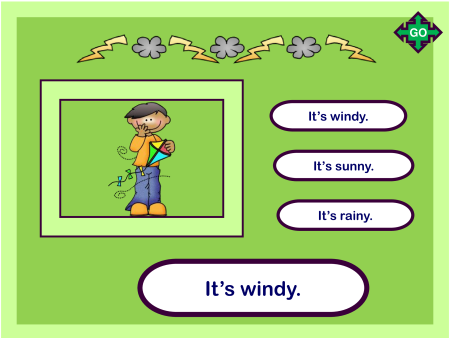 What’s the weather like? GO It’s stormy. It’s sunny. It’s rainy. It’s rainy. GO It’s windy. It’s sunny. It’s rainy. It’s windy. GO It’s partly cloudy. It’s cloudy. It’s windy. It’s cloudy.