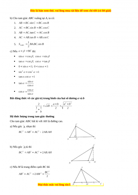b) Cho tam giác ABC vuông tại A, ta có: 1. 2. 3. 4. 5. c) Nếu thì: