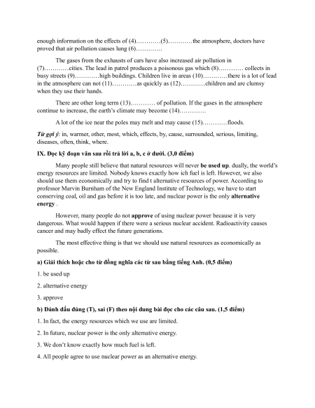 a) Giải thích hoặc cho từ đồng nghĩa các từ sau bằng tiếng Anh. (0,5 điểm) 1. be used up 2. alternative energy 3. approve