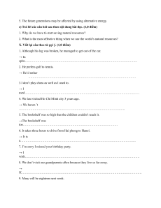 II. Chọn từ có trọng âm chính khác với các từ còn lại. (1,0 điểm) 1. A. interesting B. surprising C. amusing D. exciting 2. A. television B. expectation C. exhibition D. explanation 3. A. effective B. successful C. important D. generous 4. A. begin B. water C. open D. happen 5. A. finish B. occur C. provide D. supply