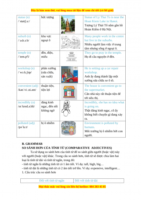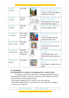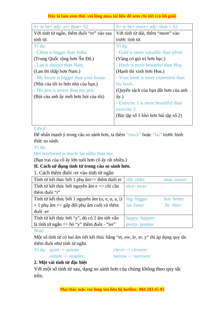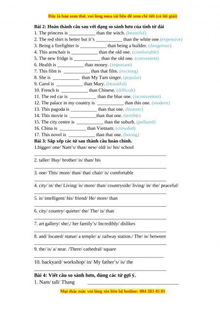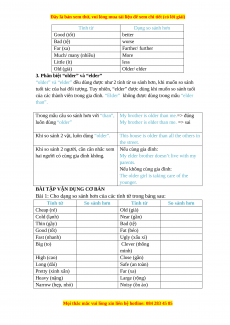 Bài 1: Cho dạng so sánh hơn của các tính từ trong bảng sau: Tính từ So sánh hơn Tính từ So sánh hơn Cheap (rẻ) Old (già) Cold (lạnh) Near (gần) Thin (gầy) Bad (tệ) Good (tốt) Fat (béo) Fast (nhanh) Ugly (xấu xí) Big (to) Clever (thông minh) High (cao) Close (gần) Long (dài) Safe (an toàn) Pretty (xinh xắn) Far (xa) Heavy (nặng) Large (rộng) Narrow (hẹp, nhỏ) Noisy (ồn ào)