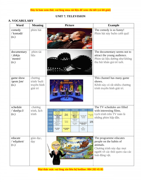 UNIT 7. TELEVISION A. VOCABULARY Word Meaning Picture Example comedy phim hài The comedy is so funny! /ˈkɒmədi/