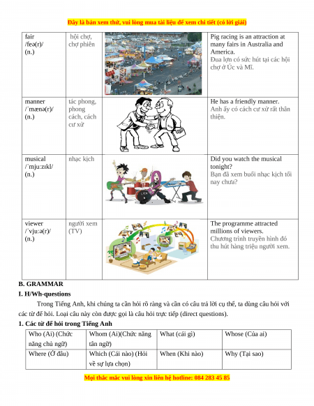 thu hút hàng triệu người xem. B. GRAMMAR I. H/Wh-questions