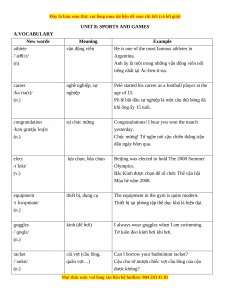 UNIT 8: SPORTS AND GAMES A.VOCABULARY New words Meaning Example athlete vận động viên