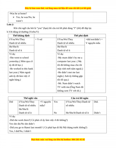 b.Với động từ thường (Verbs/V) Thể khẳng định Thể phủ định I/You/We/They + V-ed I/You/We/They +did not/didn’t + Danh từ số nhiều Danh từ số nhiều V nguyên mẫu He/She/It He/She/It Danh từ số ít Danh từ số ít Ví dụ: Ví dụ: -She went to school -My mum didn’t by me a yesterday.( Hôm qua cô computer last year. ( Mẹ ấy đã đi học.) tôi đã không mua cho tôi -He worked in this bank máy tính mới năm ngoái.) last year.( Năm ngoái -He didn’t met me last anh ấy đã làm việc ở night.( Anh ấy không gặp ngân hàng.) tôi tối qua.) -Mr. Nam didn’t watch TV with me.(Ông Nam đã không xem TV với tôi.) Thể nghi vấn Câu trả lời ngắn Did I/You/We/They +V nguyên Yes I/You/We/They/Danh từ Did. Danh từ số nhiều mẫu? số nhiều He/She/It Danh từ số ít No He/She/It/Danh từ số ít Didn’t Ví dụ: