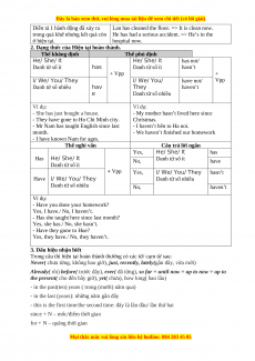- We haven’t finished our homework - I have known Nam for ages. Thể nghi vấn Câu trả lời ngắn Yes, He/ She/ It has Has He/ She/ It Danh từ số ít No, have Danh từ số ít + Vpp Yes, I/ We/ You/ They hasn’t Have I/ We/ You/ They Danh từ số nhiều Danh từ số nhiều No, haven’t Ví dụ: - Have you done your homework? Yes, I have./ No, I haven’t.
