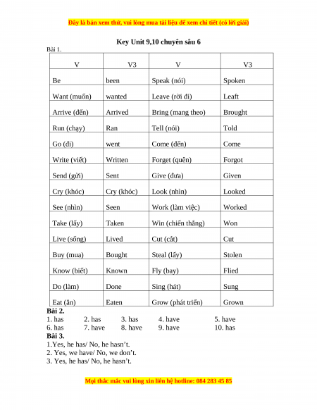 Key Unit 9,10 chuyên sâu 6 Bài 1. V V3 V V3 Be been Speak (nói) Spoken Want (muốn) wanted Leave (rời đi) Leaft Arrive (đến) Arrived Bring (mang theo) Brought Run (chạy) Ran Tell (nói) Told Go (đi) went Come (đến) Come Write (viết) Written Forget (quên) Forgot Send (gửi) Sent Give (đưa) Given Cry (khóc) Cry (khóc) Look (nhìn) Looked See (nhìn) Seen Work (làm việc) Worked Take (lấy) Taken Win (chiến thắng) Won Live (sống) Lived Cut (cắt) Cut Buy (mua) Bought Steal (lấy) Stolen Know (biết) Known Fly (bay) Flied Do (làm) Done Sing (hát) Sung Eat (ăn) Eaten Grow (phát triển) Grown Bài 2. 1. has 2. has 3. has 4. have 5. have 6. has 7. have 8. have 9. have 10. has Bài 3.