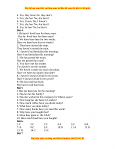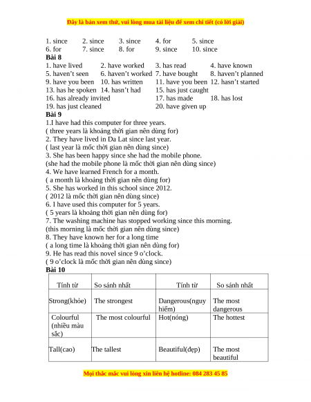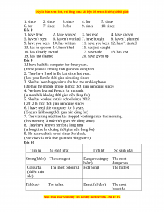 1. since 2. since 3. since 4. for 5. since 6. for 7. since 8. for 9. since 10. since Bài 8 1. have lived 2. have worked 3. has read 4. have known 5. haven’t seen